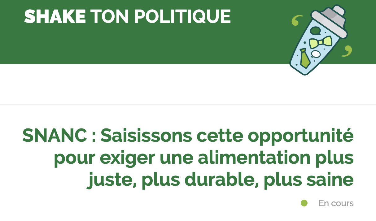 Qu'il s'agisse de la réduction de l'empreinte carbone de nos repas, de la lutte contre les maladies chroniques, de la diminution des disparité sociale liées à l'alimentation, de la prise en compte des souffrances animales : nous demandons que trois éléments soient ajoutées à la SNANC :
